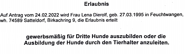 10/2024 Amt für Veterinärwesen und Verbraucherschutz - Prüfungen für Erlaubnis- gewerbsmäßig für Dritte Hunde auszubilden oder die Ausbildung der Hunde durch den Tierhalter anzuleiten.